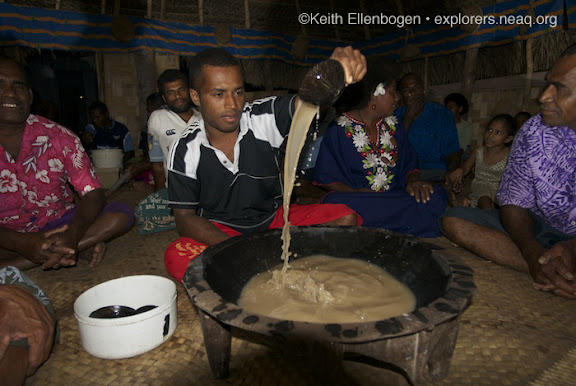 The music ranged from traditional Fijian songs to the Beatles, Jimmy Buffet and the Eagles. Imagine our surprise when the village women presented us with trays of cakes, breadfruit, and complete tea service! It seemed as though we could have stayed and partied all night with them and not worn out our welcome, but it was time to board the skiffs and return to the NAI'A to enjoy the dinner cooked in the lovo pit and start our long southerly transit tonight from this area to the island of Gau (pronounced 'now'). I hope I can return to Fiji again someday to re-experience the warmth and welcome of these wonderful people.